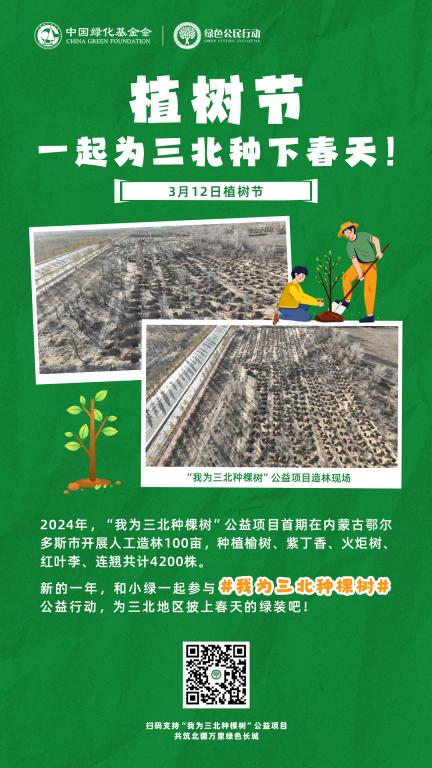 若你也想为三北地区的春天添一抹绿,那就加入我们的“我为三北种棵树”公益项目吧!每一棵你种下的小树,都将成为三北大地生机的起点,为这片土地带来更多盎然绿意,一同助力守护美丽中国。